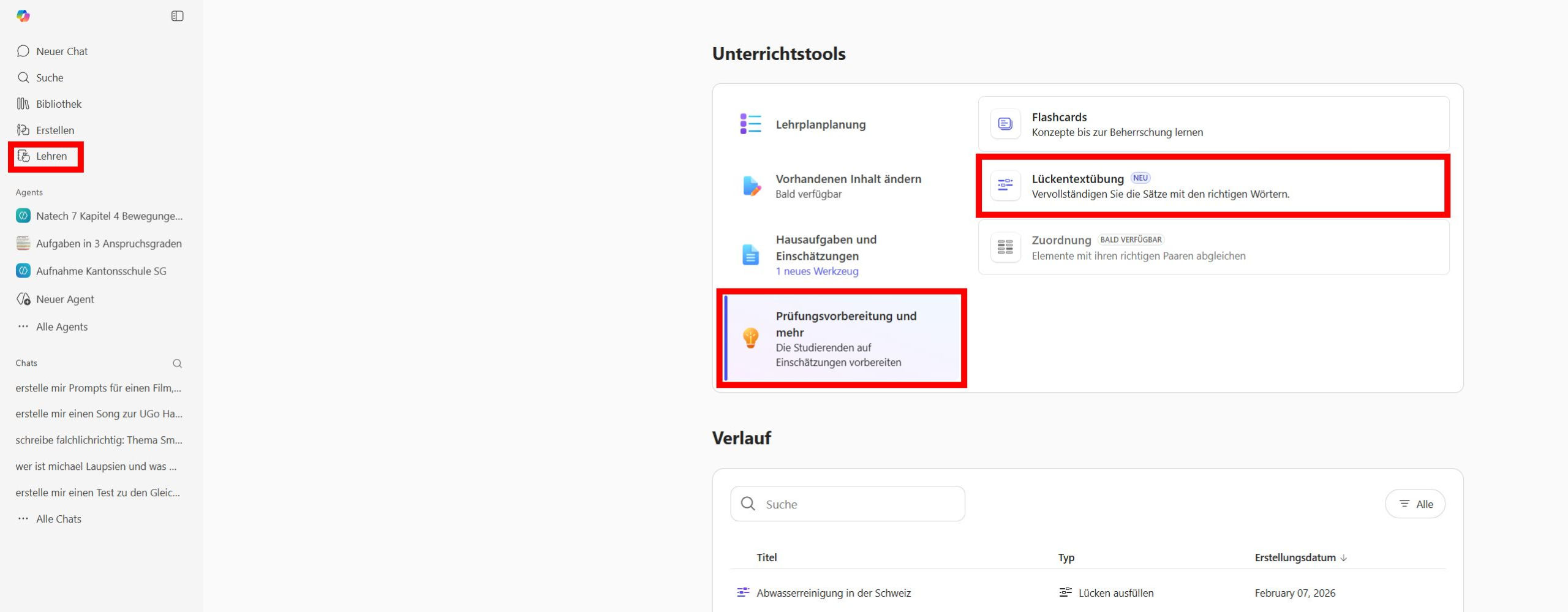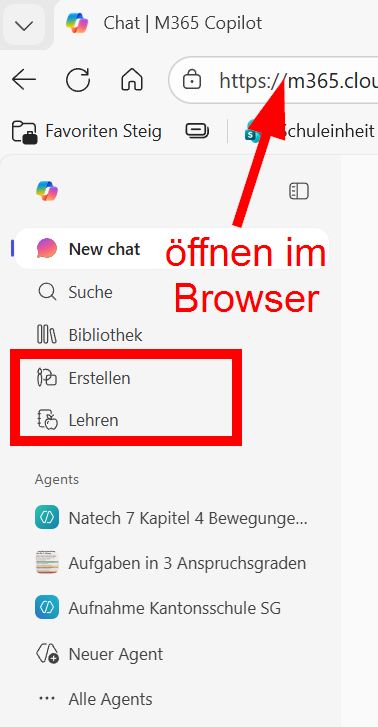 Es gibt neue Möglichkeiten auf Copilot unter „Erstellen“ und „Lehren“