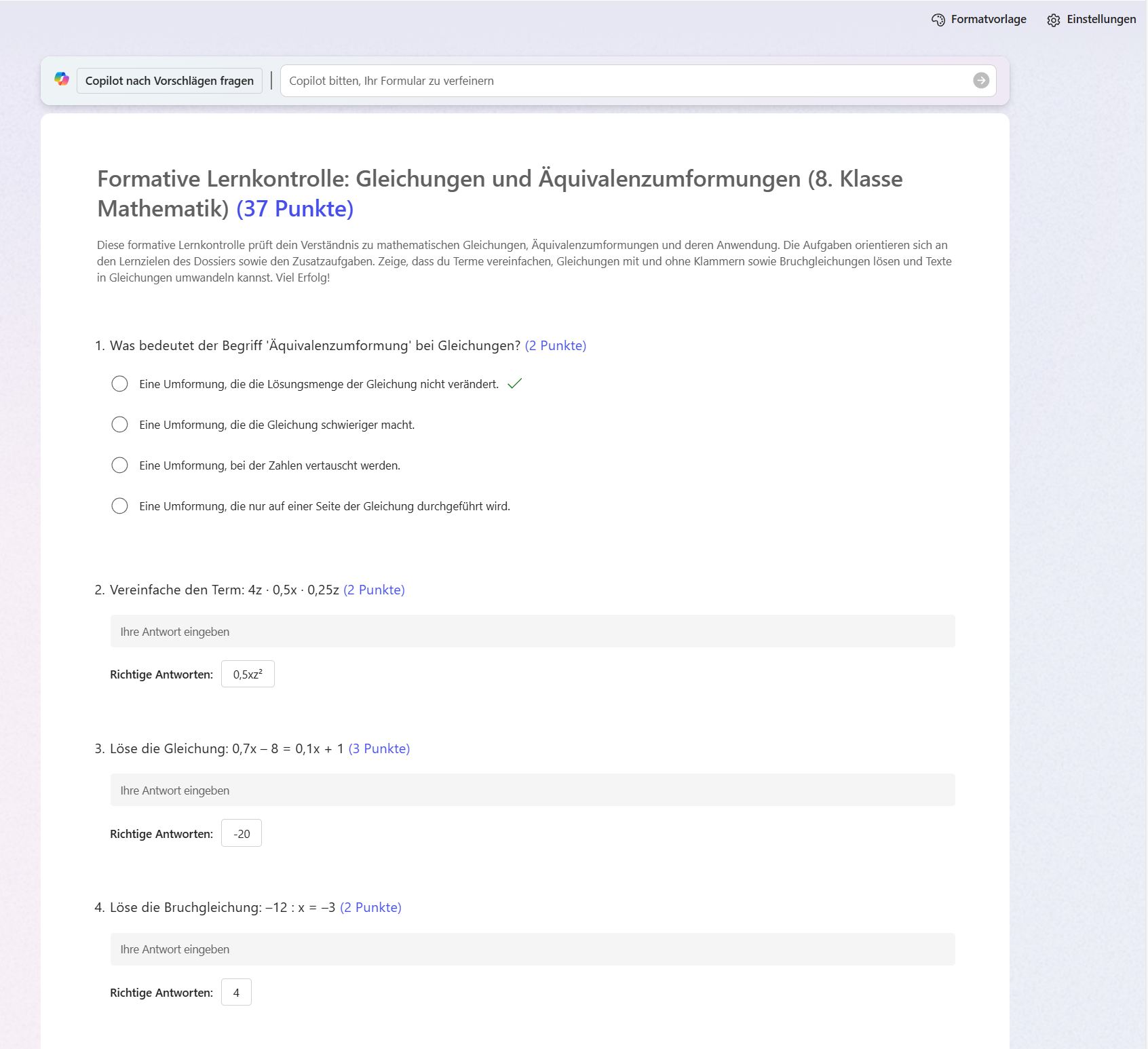 Copilot stellt das Quiz im entsprechenden Format zur Verfügung, sodass es von Lernenden unmittelbar online gelöst werden kann.