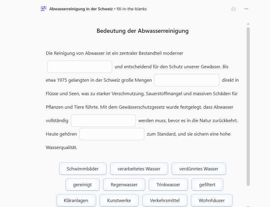 Anschliessend erhalten die Lernenden einen automatisch generierten Vorschlag. Die einzusetzenden Wörter werden am unteren Rand übersichtlich eingeblendet. Das Tool hat den Text selbstständig in sinnvolle Abschnitte gegliedert. Die Schüleransicht wirkt ansprechend und motivierend und erfüllt ihren Zweck vollumfänglich.