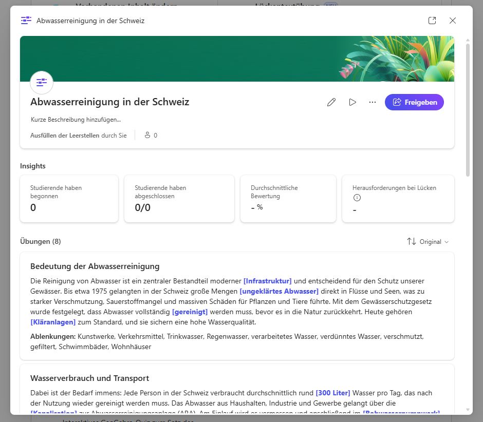 Eine weitere Neuerung unter „Lehren“ ist die Möglichkeit, Lückentexte zu erstellen und zu verteilen. Zwar gibt es sicherlich andere Anbieter, die ähnliche Funktionen anbieten, doch der visuelle Aufbau sowie die Option, die Aufgaben direkt über Microsoft Teams an die Schülerinnen und Schüler auszugeben, wirken sehr vielversprechend.