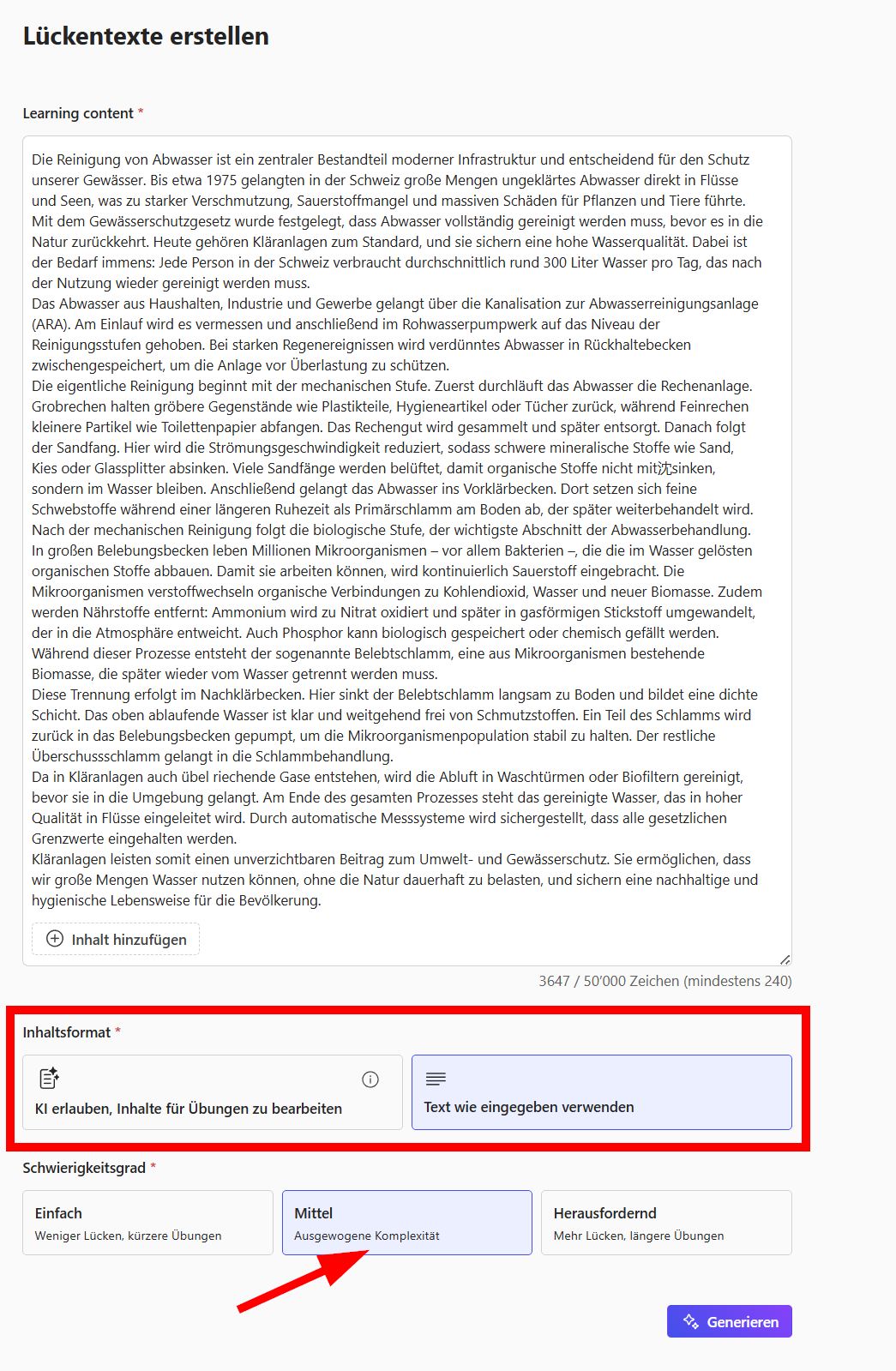 Für unser Beispiel haben wir erneut das Thema der Kläranlage gewählt. Der zugrunde liegende Text wurde bewusst nicht zu lang gehalten. Der Schwierigkeitsgrad des Lückentextes lässt sich flexibel einstellen, ebenso kann festgelegt werden, ob Copilot den Text zusätzlich überarbeiten soll.