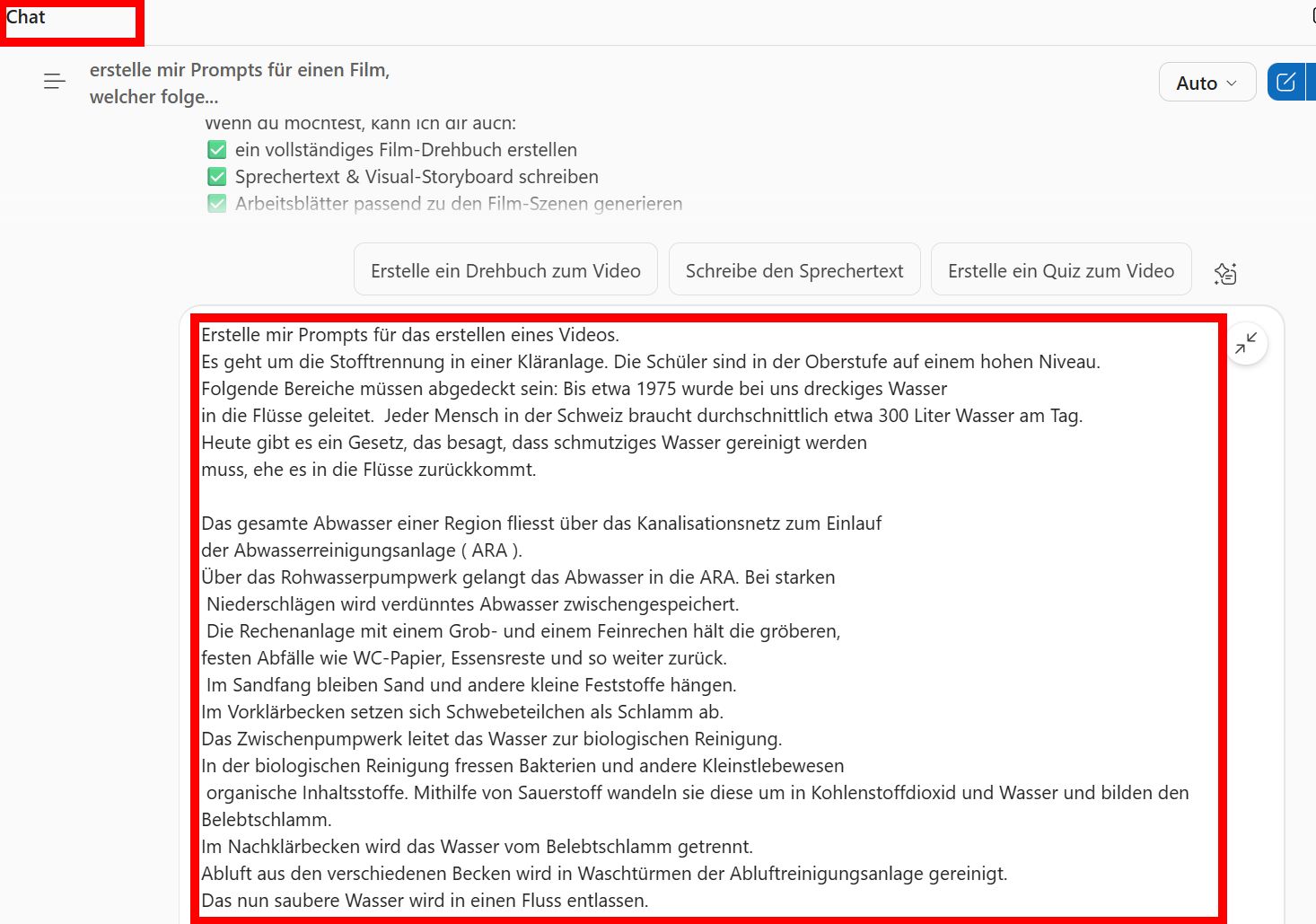 Dafür arbeiten wir direkt mit dem Copiloten: Wir geben ein, welche Inhalte der Film vermitteln soll. Als Grundlage verwende ich meine bereits formulierten Lernziele und kopiere die relevanten Unterlagen in das Eingabefeld.