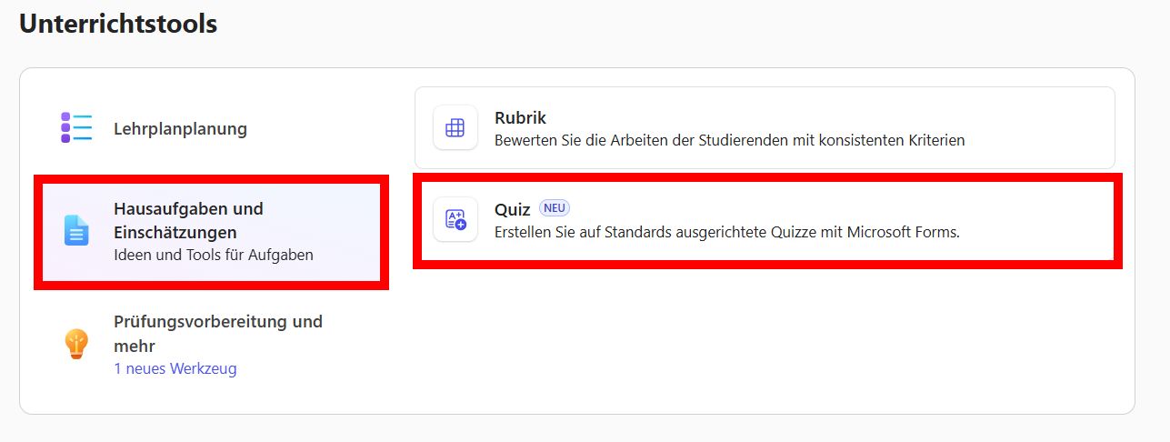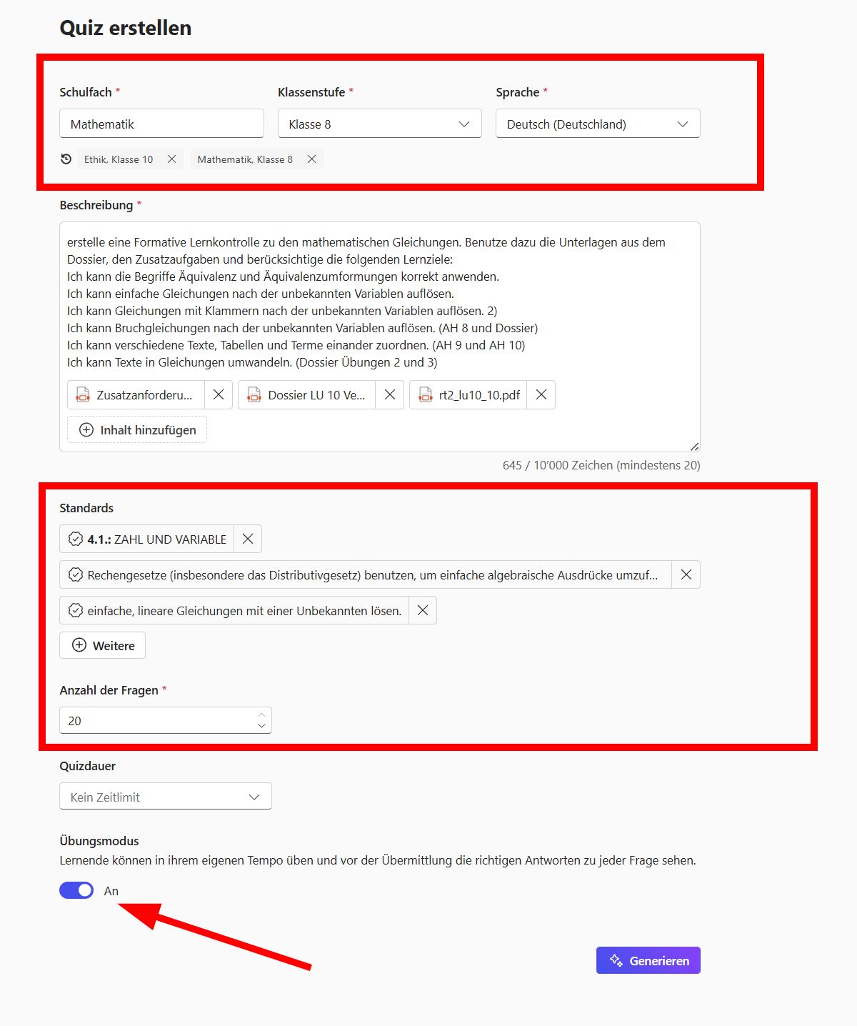 Unter „Erstellen“ steht neu die Möglichkeit zur Verfügung, ein Quiz zu generieren. In unserem Beispiel nutzen wir diese Funktion als formative Lernkontrolle im Fach Mathematik. Dazu haben wir die relevanten Lernziele notiert und die verwendeten Unterrichtsmaterialien beigefügt. Auch die Klassenstufe sowie die entsprechenden Kompetenzziele wurden angegeben.
